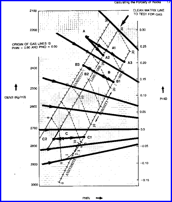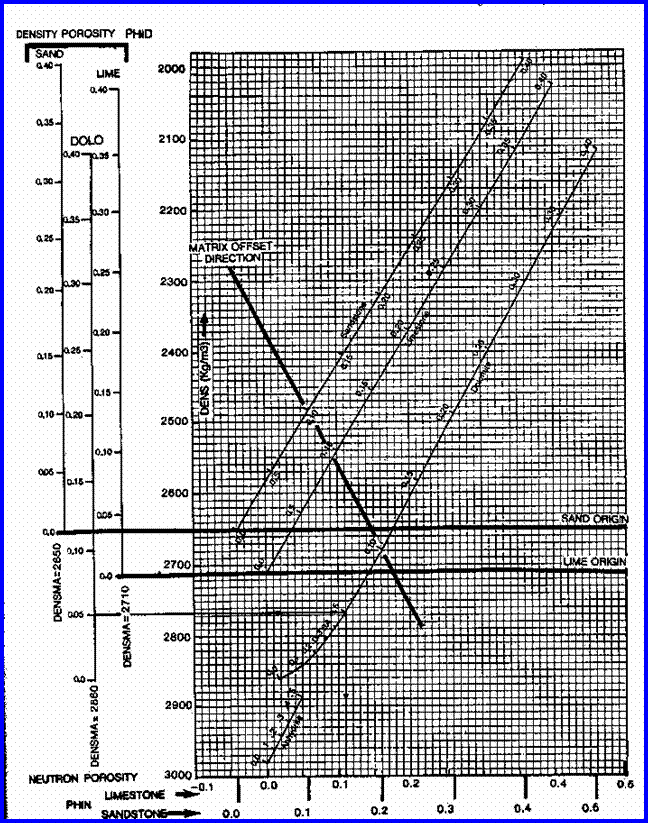 Density Neutron Complex Lithology Crossplot - Gas zones with NO crossover. Enter shale corrected data and then slide data point to the right until it reaches the line representing the matrix density of the reservoir - travel parallel to the nearest heavy black line. Do not use Dolomite scale log for this special case.