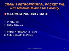 Using the PHIMAX equation with a PHIMAX of 0.30:PHIe = (1 - 0.65) * 0.30 = 0.105