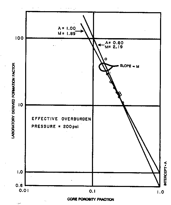 Archie initially proposed that A = 1.0, M = 2.0, and N = 2.0; later it was found that these values varied with rock type. When electrical properties are available, they should be used, provided they fall within reasonable ranges and the data set is large enough to be valid. Data is usually presented in tabular as well as graphical form, as shown below.