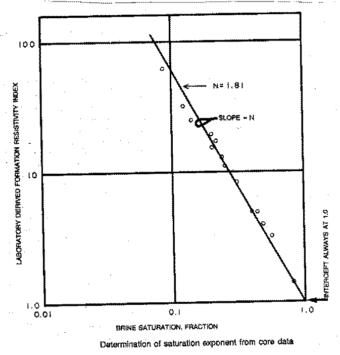 The value for the saturation exponent N is usually found in the laboratory as shown above. It is a plot of resistivity index ( I ) versus water saturation. Several partial saturations are taken on each core plug and N is determined from the slope of the line through these points. N can be varied by defining lithofacies for each core plug and relating this to some log signature.