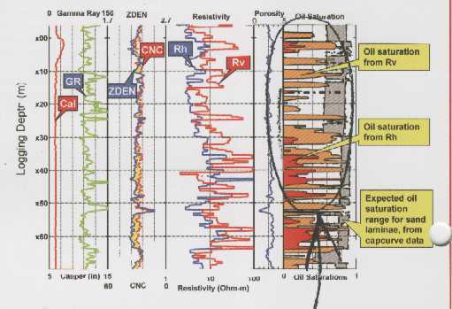 In the example above, density neutron crossover shows gas pay in zones with horizontal resistivity of less than 3.0 ohm-m. This crossover is not caused by bad hole conditions or inappropriate density neutron porosity scales. The vertical resistivity shows the effect of the gas, while the horizontal resistivity is dominated by the conductive shale laminations. While gas zones stand out because of gas effect on the density neutron, oil zones will not be so obvious. Pay attention to sample descriptions, oil shows in core or on the mud pit, and the mud log, especially the higher C4+ curves.