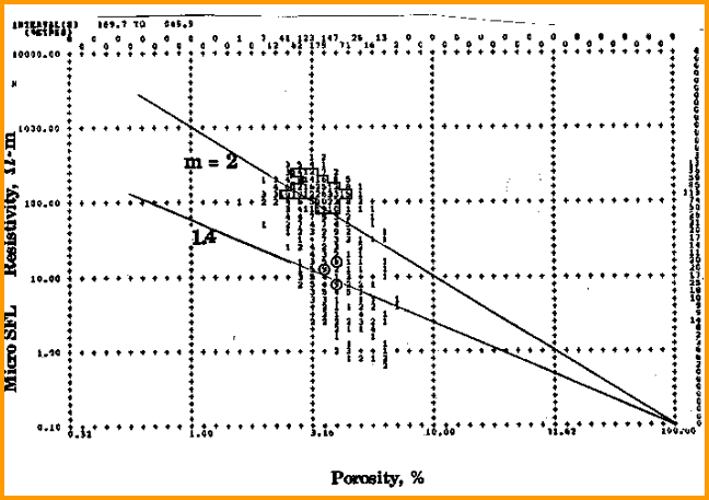 The major complication is that a large fracture will be deeply invaded by mud filtrate and will be full of water at logging time, yet be full of oil or gas at static or producing conditions. The host rock will not invade as deeply so the saturation distribution while logging is not as neat or as predictable as in un-fractured rocks. In many situations, a simple approach using the Archie water saturation equation with a low value for M is satisfactory. Use the Pickett plot to determine M from a shallow resistivity log. Careful zonation may be required to isolate heavily fractured from less fractured intervals. If M seems to be too high, then the shallow resistivity is seeing residual hydrocarbons. The variable M approach based on any one of the methods given in previous Sections can also be used.