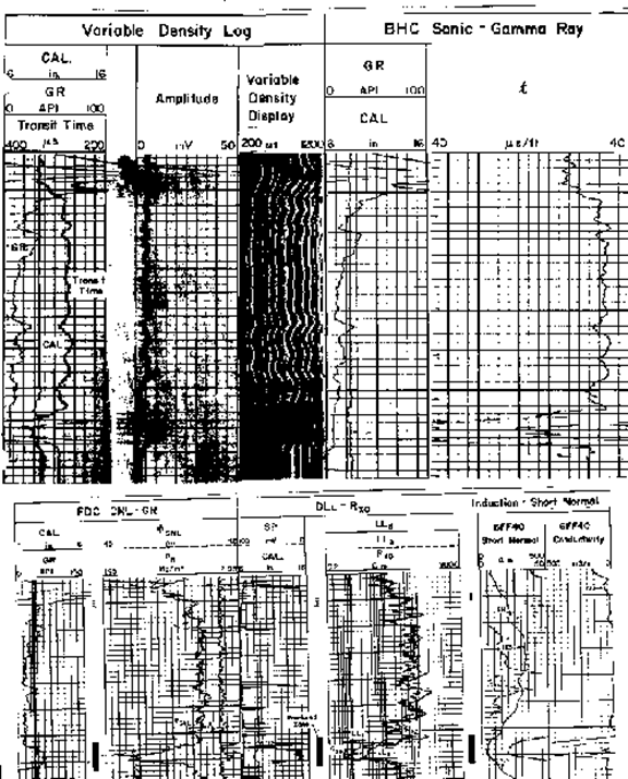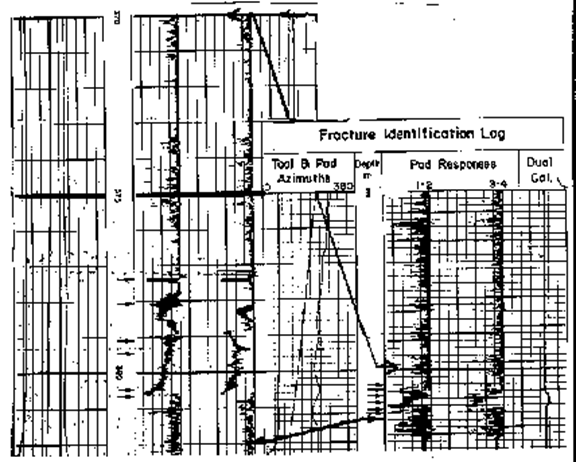 Finally, the dipmeter fracture identification log clearly shows the fractures as individual anomalies. Six different anomalies can be defined; some probably are sub-horizontal. Very short vertical fractures are also present. There was a serious loss of circulation opposite this zone when the well was drilled.