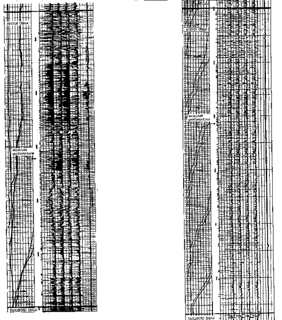 Logs from 3 different Austin Chalk wells are shown in here. They all demonstrate the typical Austin Chalk pattern of heavy fractures near the top of the zone, grading to few fractures near the middle. The amount of fracturing does vary considerably between wells. This can be seen by the different amount of activity on the dipmeter curves and is also reflected in the initial production of the wells.