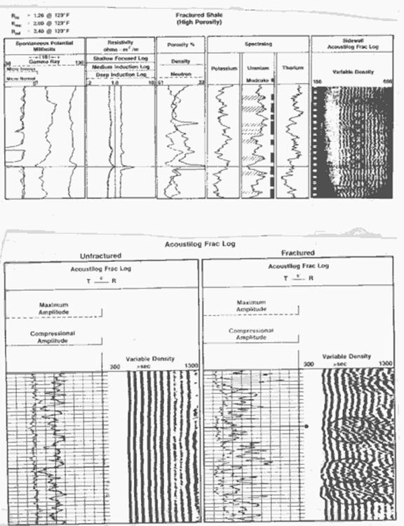A portion of un-fractured log is shown opposite a fractured section for comparison in the bottom half of the above illustration. Notice the different character between the compressional amplitude and the variable intensity display. The chevron patterns are quite distinct.