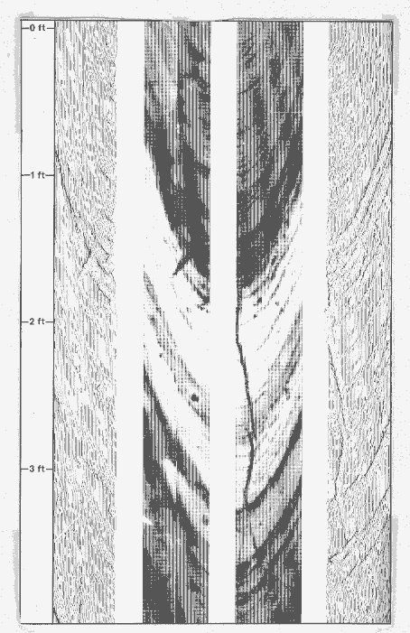 The formation micro-scanner image of a similar fractured shale is shown above. Notice the steep dips, fine bedding, and the fracture. The sand/shale ratio can be determined easily by computer processing of the image.
