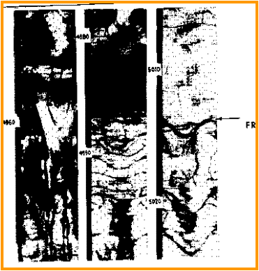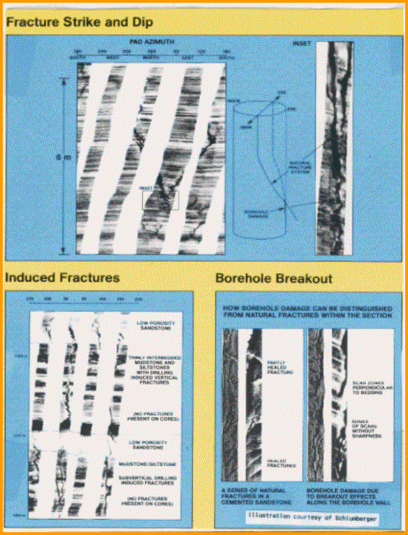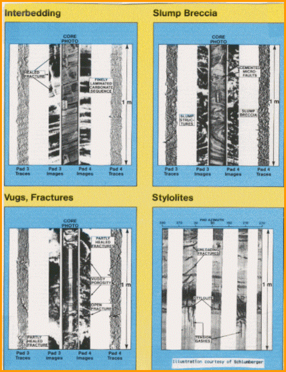 The image depth scale is usually 1:20 or 1:40, and the X axis is scaled from -180 to +180 degrees around the borehole, putting North in the middle of the track. Examples are provide above. A dramatic near vertical fracture can be seen. Two vertical scales are used: one for reconnaissance and one for detail evaluation. Fracture orientation is roughly NNW - SSE dipping at more than 80 degrees. Other images on these two figures illustrate induced fractures, borehole breakout, inter-bedding laminations, slump brecchia, vugs with fractures, and stylolites.