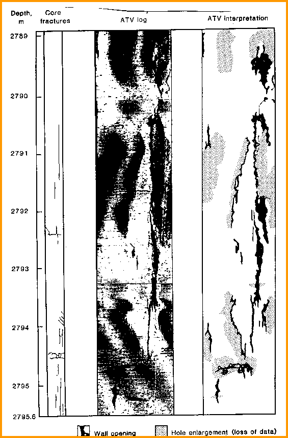 Considerable research is being conducted to enhance the televiewer images, using both arrival time and amplitude of the sound waves, plus computer methods for image enhancement, especially edge enhancement to resolve fractures and bed boundaries. Modern televiewer logs can be used effectively in more rugged boreholes than older versions because of the new processing techniques. Be aware of the age of the log before you start your analysis.