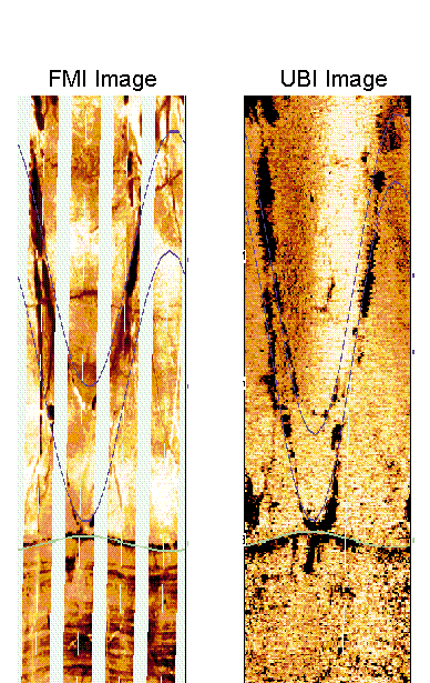 Comparison of resistivity image log (left) and ultrasonic image log in the same borehole. The higher spatial resolution and the higher dynamic range of the resistivity image is clear. Black colour represents low acoustic impedance on CBIL/ UBI, or low resistivity on FMI, in this case representing fractures (near vertical) or shale beds (near horizontal).