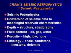 method (shale corrected) Refl = reflection coefficient (fractional) Refl1 = reflection coefficient of upper layer (fractional) Sw = water saturation in undisturbed zone (fractional) Sxo = water saturation in invaded zone (fractional) T1 = two way seismic time at top of layer (sec) T2 = two way seismic time at bottom of layer (sec) Tc = time at first arrival of compressional wave (usec) Ti = two way interval time through layer (sec) To = near trace (vertical) two way travel time (sec) To = time at onset of sound impulse (usec) Ts = slant path time (sec) Ts = time at first arrival of shear wave (usec) Tv = vertical time (sec) Tx = far trace (slant path) two way travel time (sec) Vavg = average velocity (ft/sec or m/sec) Vc = compressional velocity (m/sec) Vint = rock layer interval velocity (ft/sec or m/sec) Vinv1 = interval velocity of upper layer (ft/sec or m/sec) Vinv2 = interval velocity of lower layer (ft/sec or m/sec) Vo = initial velocity near surface (ft/sec or m/sec) Vp = compressional wave velocity (ft/sec or m/sec) Vrat = velocity contrast (ratio lower to upper layer velocity) Vs = shear velocity (ft/src or m/sec) Vst = Stoneley velocity (ft/sec or m/sec) Vstk = stacking velocity (ft/sec or m/sec) Vstk1 = root mean square velocity at top of layer (ft/sec or m/sec) Vstk2 = root mean square velocity at bottom of layer (ft/sec or