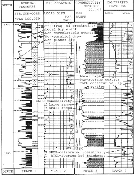 Curve shape analysis depends almost entirely on the shape of the SP or GR curves versus depth, so the shale volume/grain size/depositional energy relationship is a strong component of our analysis method. The reconstructed resistivity curve from the dipmeter or a microresistivity curve can also be used as a grain size indicator in shaly sand sequences. An example is shown below, from a SYNDIP presentation.