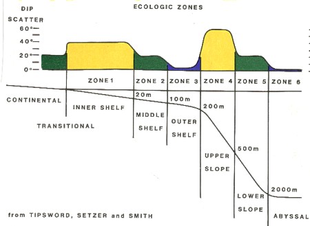 The continental slope and abyssal plain zones also have distinctive energy patterns, with very high energy at the upper slope, due to slumping and turbidity currents. Energy levels decrease rapidly with distance from the upper slope. This results in dip ranges of 60 degrees in the upper slope zone to a few degrees in the abyss, corresponding to Zones 4, 5, and 6.
