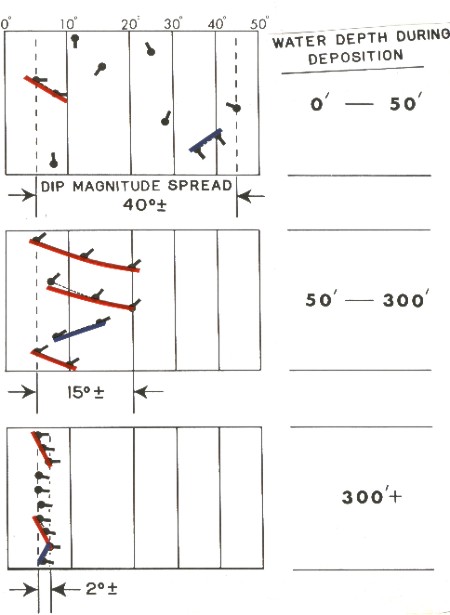 As described earlier, a strong correlation exists between depositional energy and grain size of the rocks. The larger the grain size, the greater the depositional energy. Therefore, steep current bedding, which can only be supported by large grains, is usually interpreted as high energy deposition. Flatter beds represent lower energy deposition. This rule usually holds when deposition occurs in a place away from the transportation artery, such as in a delta front or when deposition is associated with ocean wave energy.