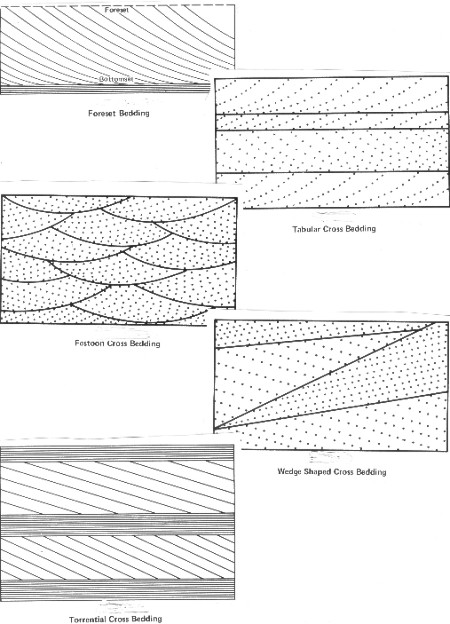 Planar or tabular bedding, as the words suggest, involve flat layers of rock (maybe lying at an angle) laid down in streams, lakes, or in deltas. Festoon bedding creates layers which are convex top and bottom, and are usually laid down in braided streams. Wedge shaped or nonparallel bedding is planar bedding with concurrent erosion which has removed a portion of the bed, such as on the curve of a meandering river. Examples of these bedding patterns are given below.