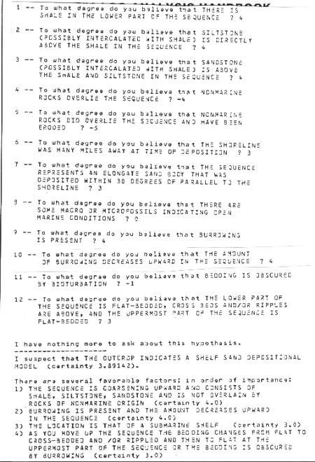 Combining the rules for grain size indicators, dip spread, current bedding, and curve shape is a formidable task. Add to this the palynology and paleontology (micro and macro fossils), as well as the lithology descriptions, and you have an almost undecipherable problem to solve. A rule based expert system could be constructed from the tables given above. An example is shown below, from a USGS program.