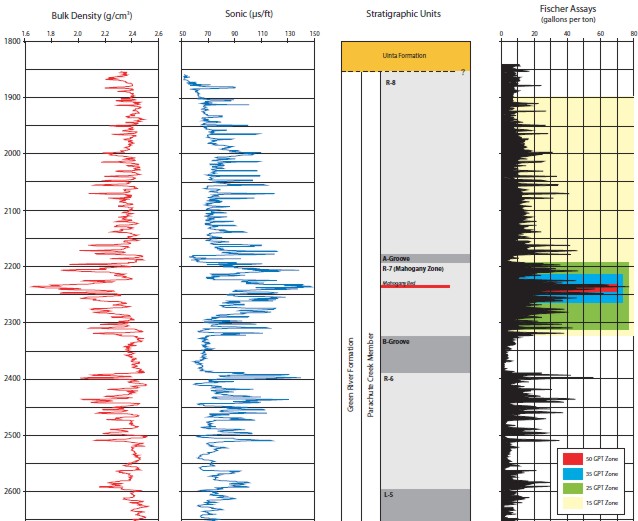 Fischer oil yield in gallons/ton (right). Note sonic scale is