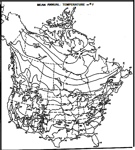 Mean Annual Surface Temperature Map for North America - degrees F