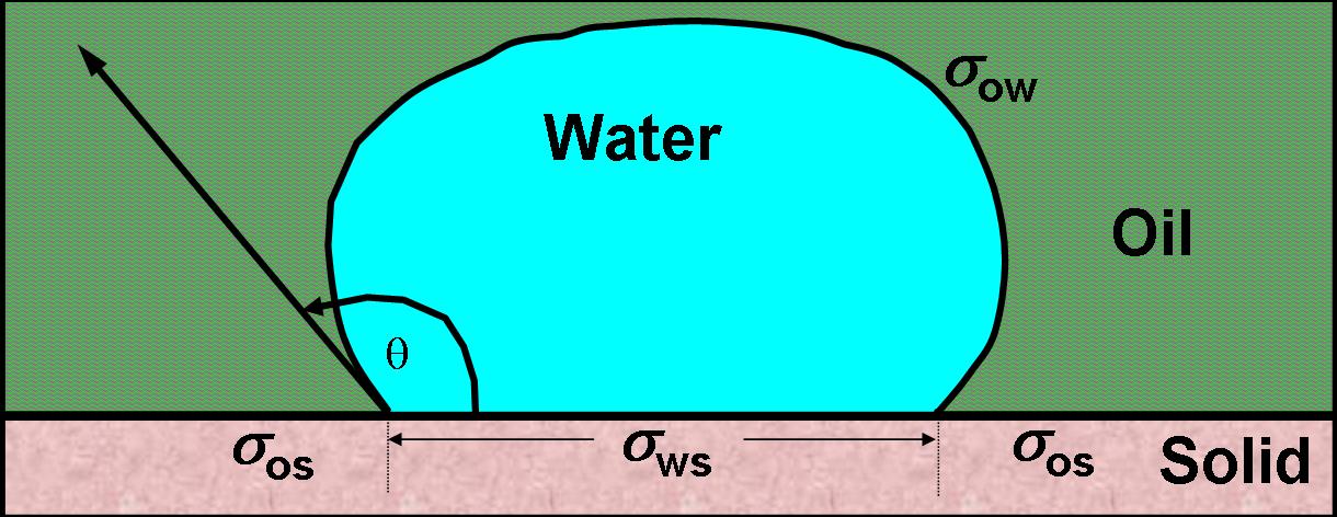 (water) preferentially wets the solid surface (and
