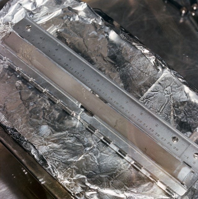The two drive-tube cores from Apollo 16 and 17 have never been seen by human eyes. They were sealed in their tubes under the vacuum of the moon and sealed in a second vacuum container at the vault in Houston. These pristine samples await investigation by "more sophisticated techniques" than are presently available. High resolution core photos like the one at the left  are at http://curator.jsc.nasa.gov/lunar/cores/cores.cfm.