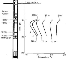 First logs on the Moon, Apollo 15, 1971. These temperature versus depth logs parallel similar surveys by Lord Kelvin in 1869. The lunar temperature probes continued to transmit data to Earth after the astronauts left the Moon. On Terra, we were just beginning to record logs in digital form, and were a couple of years from sending digital logs by satellite to processing centers. X's represents projected stabilized temperature profile.
