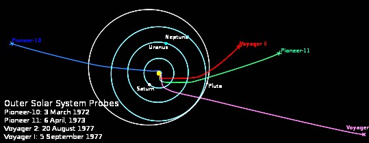 Trajectories of Voyager and Pioneer spacecraft as they leave the solar system (2007). Voyager 1 is rising above the ecliptic and Voyager 2 is dropping below it. Who knows what these logging tools will find? Pioneer 10 and 11 are leaving more slowly and in opposite directions, but neither is still logging what they see.