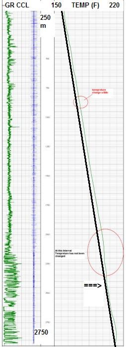 temperature log. Dark diagonal line is a constant gradient. Coolest