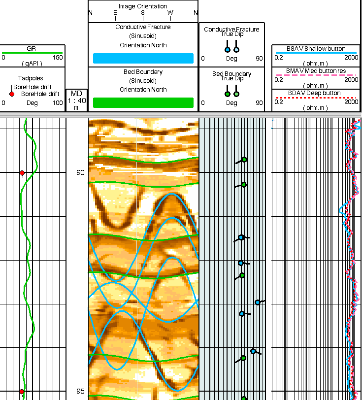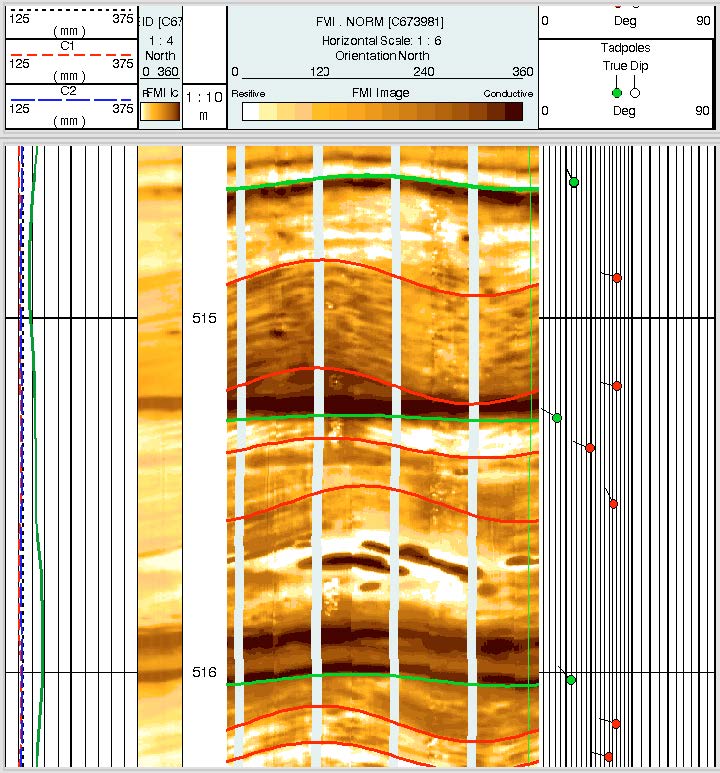 left, resistivity image, dip tadpoles, and 3 resistivity curves