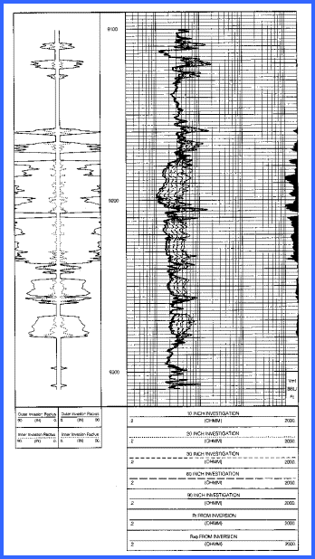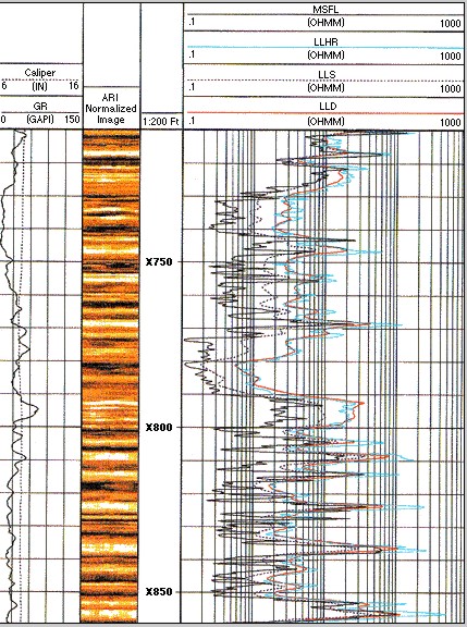 Comparison of array induction log (left) and azimuthal resistivity laterolog (right). Curve complement and