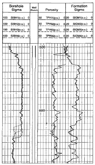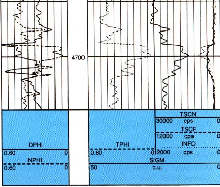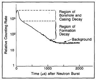 The neutrons are quickly slowed down to thermal energies by successive collisions with atomic nuclei of elements in the surrounding media. The thermalized neutrons are gradually captured by elements within the neutron cloud, and, with each capture, gamma rays are emitted. The rate at which these neutrons are captured depends on the nuclear capture cross sections, which are characteristic of the elements making up the formation and occupying its pore volume. The gamma rays of capture which are emitted are counted at one or more detectors in the logging tool during different time gates following the burst, and from these counts the rate of neutron decay is automatically computed. One of the results displayed is the thermal decay time, TAU, which is related to the macroscopic capture cross section of the formation, SIGMA, which is also displayed.