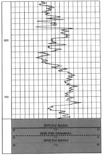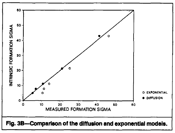 With older tools, the decay time curve was approximated using a sum of exponentials, from which the borehole decay contribution needed to be removed. The residual (non-exponential) diffusion was subtracted from formation sigma, using chartbook solutions based on laboratory calibrations. It was also necessary to make appropriate environmental corrections. The exponential method created a dependence of formation sigma on the nature of the borehole fluid. The modern dual burst system accounts explicitly for thermal neutron diffusion, using a closer solution to the neutron diffusion equation. This model precludes the use of chartbook and environmental corrections. The improved results are obvious in the cross-plot comparing measured formation SIGMA (both models) versus inherent SIGMA.