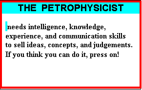 The complexity and multi-disciplined nature of petrophysics cannot be over emphasized. It is hard work and demands continuous learning - not the case with every job, but certainly true of many. If you plan to be a petrophysicist, you should decide fairly early in your career whether you want to be a full time or part time analyst, as your career path will be quite different and the market for your service will vary differently with the economic times, depending on your choice.