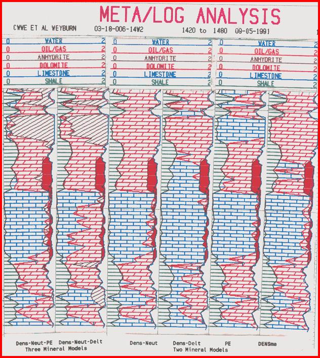 A comparison of various lithology methods is shown on Figure PP6.19. Notice that some models could not resolve for three minerals so the anhydrite zone is not portrayed correctly.