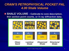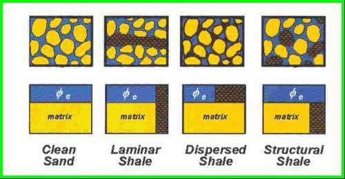 Shale distribution can vary, as shown above. The shale volume calculations shown below are insensitive to the shale distribution. However, porosity and water saturation are strongly affected by laminated shale, so the methods shown in Sections 5, 6, 7, and 8 in this handbook do not apply to laminated shaly sands.