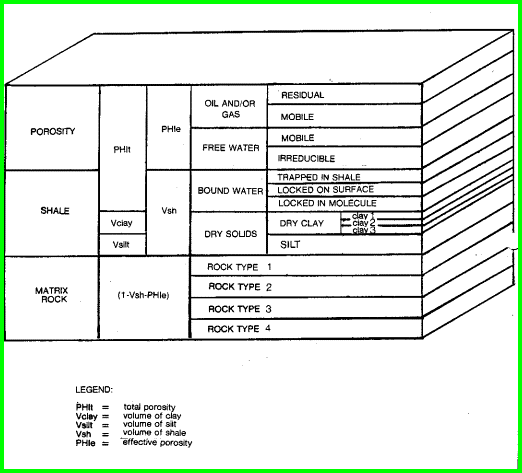 This response equation will work for sonic travel time, density, or density porosity, neutron porosity, gamma ray (and the spectrolog curves - uranium, thorium and potassium), resistivity (if Sxo is replaced by Sw for deep resistivity logs), the electromagnetic propagation log, the thermal decay time log, and the photoelectric effect (if PE * DENS is used). It will also work for various derived logs described in later chapters of this handbook. The response equations can be used in several ways. One is to find out what a log would read under a hypothetical set of circumstances. Another way is to calculate one unknown in the equation, for example porosity or shale volume, by using a log reading and assuming the other terms to be known or derivable from some other response equations. A third approach is to use sets of response equations simultaneously to determine as many unknowns as possible from the available log data. Some terms in the response equation for certain logs go to zero. This is what makes it possible, for example, to calculate the shale volume from the gamma ray response. Both the water and hydrocarbon terms go to zero, since neither of these components has any gamma ray contribution. By re-arranging terms and further assuming that porosity is small, we get: 1. VSHgr = (GR - GRmatrix) / (GRshale - GRmatrix) Here GR, GRshale, and GRmatrix are read from appropriate places on the gamma ray log to calculate shale volume. In other cases, we sometimes lump two terms together, as for water and oil in the sonic log equation for porosity. This strategy eliminates the need to know water saturation prior to knowing porosity. This approach will fail if gas is present because the water and gas contributions are too dissimilar. The algorithms in following chapters attempt to resolve as many of the unknowns as possible using these piecewise techniques. Where this is inappropriate, sets of two or three simultaneous equations are solved, with the final solution being given. It will not always be obvious that simultaneous response equations were used, but ALL deterministic log analysis methods rely on this approach. What we have done here is eliminate the repetitive derivation of the solution, and present instead the finished product, ready for inclusion in a calculator, spreadsheet or computer program.