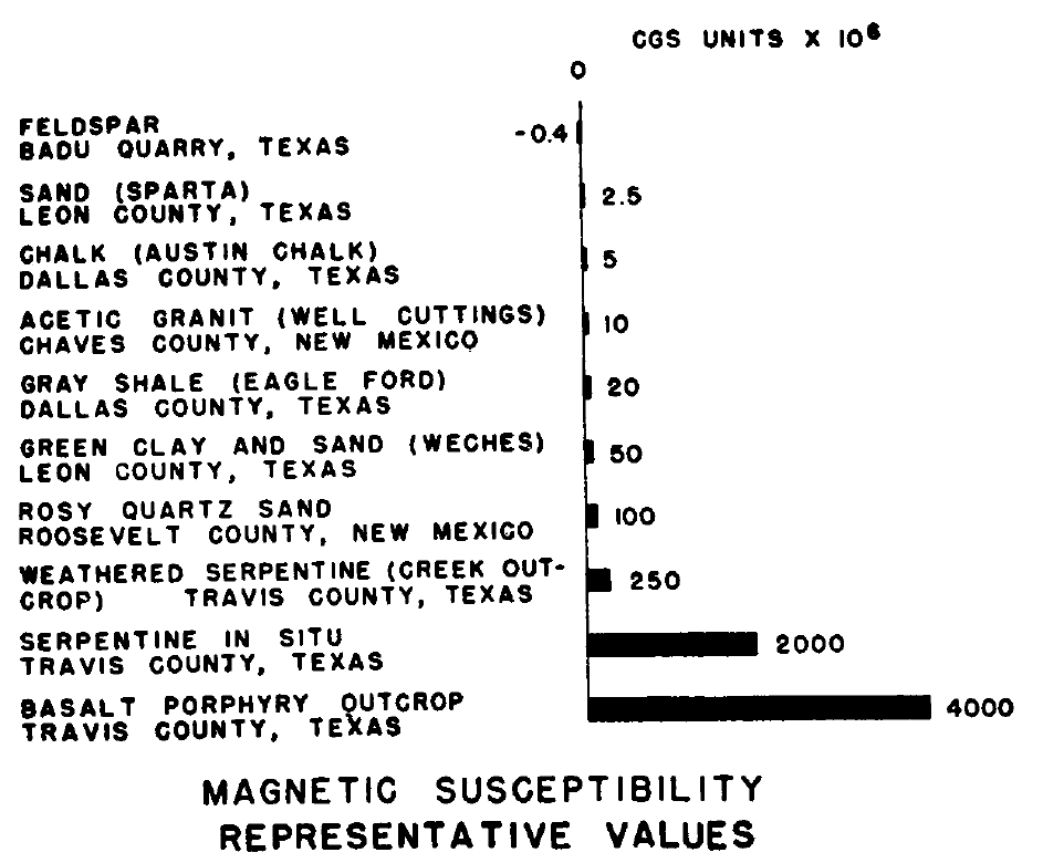 electrical conductivity (or resistivity), magnetic susceptibility,