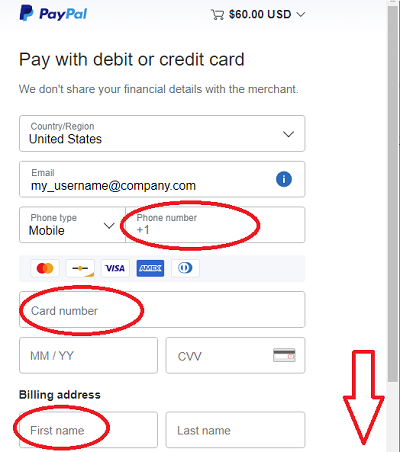 An example of some required PayPal information is circled in the screenshot below: Phone number, Card Number, First name. The PayPal form will prompt you if it is missing any required details.
