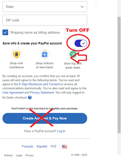 • Step 6 - Turn off the "Save info & create your PayPal account" option