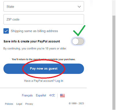 Confirm PayPal Account creation is OFF then click the "Pay now as guest" button.