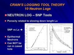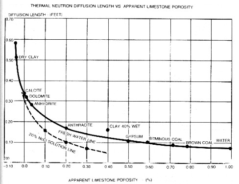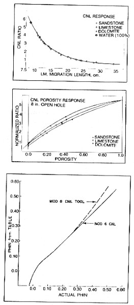Again the migration length of an arbitrary mineral or mixture of minerals can be entered into the graph to obtain the apparent porosity reading for a real thermal neutron CNL type tool. Note that real tools may use function formers or computer algorithms to modify the apparent tool response. This is shown for the 1970'x vintage Schlumberger CNL tool in the bottom graph. Considerable computer modeling of neutron response by service companies has generated numerous revisions of these response curves. Most of the effort has been directed at producing a linear porosity scale in all lithologies. Consult specific service company chartbooks for the era and tool designation. Most petrophysical analysis programs use a generic lithology correction. Some perform corrections for a specific, but unknown, tool design that may be inappropriate for the the tool under investigation. Still others offer many tool options, but not all possible tools will be listed. The generic transforms are usually sufficient for typical petrophysical analysis, except in very hot, very salty mud systems, where accurate corrections may be needed. In