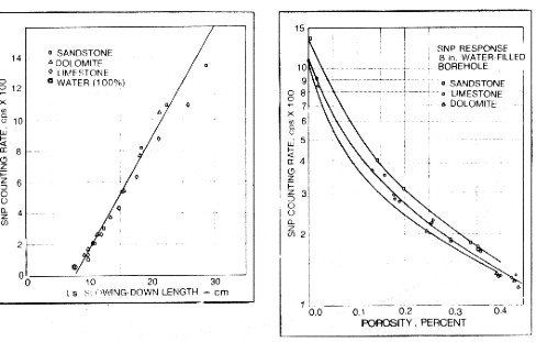 Also shown above is the same count rate data plotted against the calculated slowing down length Ls. A linear best fit is used to describe the correspondence between count rates and slowing down length. At low porosities, there is some lithological effect. Different rocks with the same count rate have different slowing down lengths. Also for some reason, the water point does not fit the line. Fortunately this is not serious as logs are seldom run in zones with more than 45% water. If we know, or can calculate, the slowing down length for neutrons of epithermal energy, in particular rocks, such as calculated in the previous Section, we can enter this value in the graph above and obtain the apparent porosity reading for a real SNP type tool.