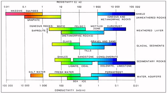 area. Where: This looks like Ohm's Law but V and I are vectors represented by complex numbers, so Z is also a complex number. Reactive and capacitive elements in the circuit cause phase shifts between V and I. Z will not be the same as R except in purely resistive circuits. The term "rms" means "root mean square", a method for averaging the absolute values of instantaneous voltage or current over time to obtain a useful value with a meter. A pure sine wave AC voltage of 10 volts rms will have a peak voltage of +/-14.1 volts. The current in a DC circuit is dissipated as heat in the resistor, but only the real component of the complex current is dissipated in an AC system. The imaginary component is converted to a magnetic field in the reactive element. Schlumberger and Lane Wells used DC circuits in their Electrical Logs (actually an alternating DC square wave to prevent polarization of the electrodes). Halliburton and Welex used AC circuits. Given identical electrode arrangements, both would give identical results in an infinite homogenous rock, but thin beds or laminated rocks could provide capacitive effects, detrimental to the AC system.