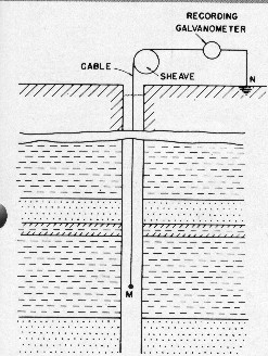 During the early days of resistivity logging, it was observed that natural potentials existed in boreholes. These are known as spontaneous potentials, or SP. A recording of the changes in SP versus depth gives the SP log. The measurement is very simple: the potential difference between an electrode M on the probe and a reference electrode N placed at the surface is measured with a voltmeter. The voltage is quite small, ranging from +50 to about –200 millivolts.