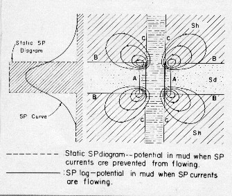 The current loops shown below circulate between shale, borehole, invaded zone, and un-invaded zone and back to the shale. They represent the sum of membrane and liquid junction potentials, which is known as the electrochemical component of the SP. The curve to the left is the corresponding SP curve as measured by a real tool. The square static SP is the theoretical shape of a perfect SP curve.