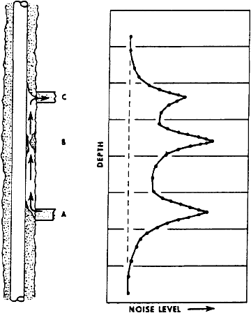 ![]() A noise log is a record of the sound measured at different positions in a borehole. Since fluid turbulence generates sound, high noise amplitudes indicate locations of greater turbulence, such as leaks, channels, and perforations. Noise logging is used primarily for channel detection, but has been used to measure flow rates, identify open perforations, detect sand production, locate casing and tubing leaks, and locate gas-liquid interfaces. Noise logs are used to identify unwanted flows behind casing, such as gas leaks to surface, crossflows between zones, coals dewatering into nearby sands, water or gas flows through bed cement into perforated intervals, and similar production problems. The log may be either a continuous record against depth or a series of stationary readings. The log may indicate the total signal over all frequencies, the signal at a single frequency, or consist of a set of log curves for different frequency ranges (spectral noise log). Different frequency ranges can be associated with different sources of noise or different flow regimes. The tool was first introduced around 1955, but the technique was not used commercially until after laboratory studies in the early 1970s. The noise logging tool is a passive device recording downhole noise using piezoelectric crystals (transducers) which convert the wellbore sound to a corresponding voltage. The voltage variations are passed through a number of high pass filters, usually 200, 600, 1,000, and 2,000 Hz, giving a spectral noise log. Low frequency sounds are associated with tool movement and ambient sounds carried by the pipe. Mid-range and higher frequency are interpreted as fluid flow through constrictions, with gas movement most likely at the highest range.