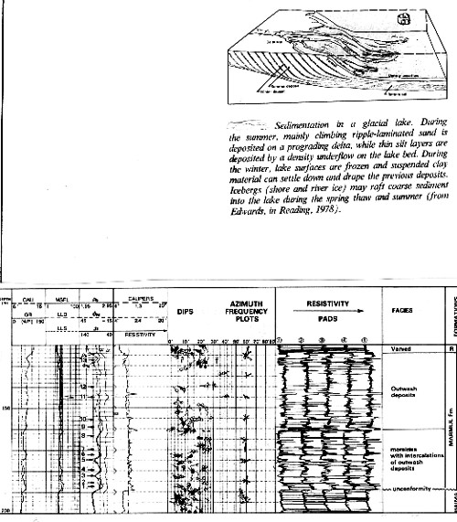 Varves are very thin, roughly horizontal layers deposited in a glacial lake bottom from debris rafted out by the ice. At the edge of the lake, distributary channels deliver sediment to delta type deposits with typical delta front foreset beds. Dipmeter patterns look like delta front distributary mouth bar patterns, but bedding planes are very close together. These occur only behind a receding ice front. Advancing ice will scour away any evidence of the lacustrine delta. A schematic drawing of a glacial lake environment and a typical dipmeter in a glacial environment appear below.