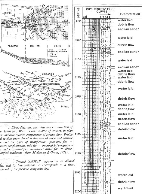 Alluvial fans are long in the down slope direction and very narrow. Thickness varies from a few hundred to several thousand meters. Dip angle is high and scattered. Dip direction is not a good indicator of body geometry. The lower reaches of the fan may grade into a braided stream environment.