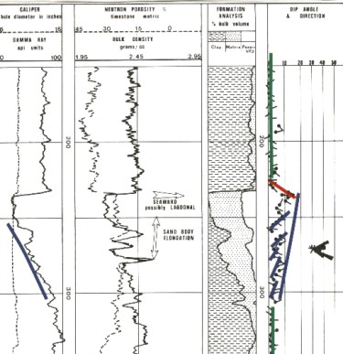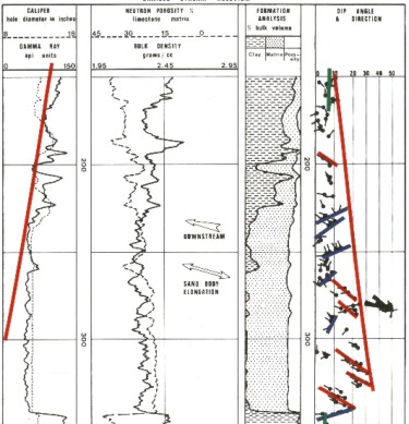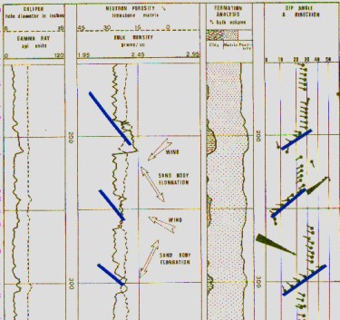 Dip magnitude will be erratic and high angled at the base in the festoon bedded sands, progressively becoming more consistent and flatter upwards in the tabular beds. Because of the wide swing in the direction of the depositing currents and the type of current bedding, a variation in dip direction of 180 degrees is normal. The average dip direction should reflect the overall downstream direction of the meander belt and the trend of the separate reservoirs.