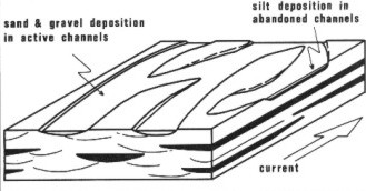 Braided stream deposits are the result of an interlaced network of sinuous channels exhibiting flood stage scouring and subsequent channel filling. A channel is no sooner cut than it chokes on its own detritus. This is dumped in the form of bars in the center of the channel around which two new channels are diverted.