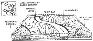 The meandering streams of the plains areas grade into delta distributary channels in the exposed delta areas. These channels are relatively straight and are cut into young, soft sediments. Natural levees formed of clays and silts contain the channel in a fixed position.