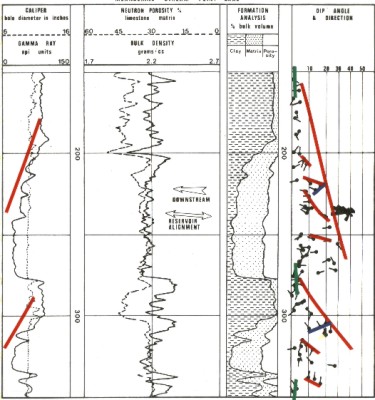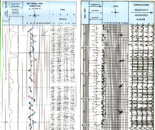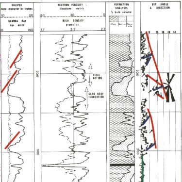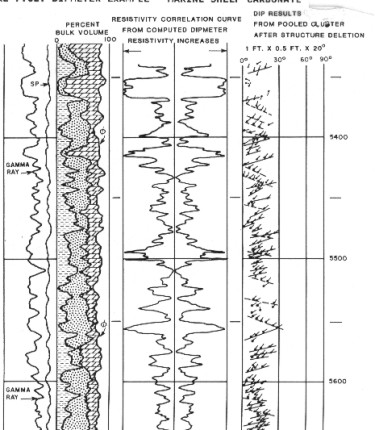 The character of log curve and dip plots on shelf carbonates is very dependent upon the degree of shaliness. Massive limestones give rise to cylindrical or straight line gamma ray curves; interbedded shale creates a serrated effect. Dips measured in massive limestones are likely to present an incoherent pattern, being mainly the result of vugs and fractures. To be able to measure meaningful dips, it is necessary to have recognizable bedding planes which are mainly due to variations in shaliness. The degree of bedding is revealed by the character of the dip plot or the GEODIP correlation lines.